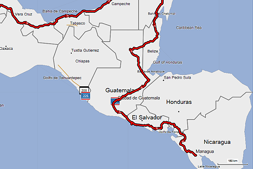Bereits in Mexiko habe ich mich an die hohe Präsenz von Soldaten und Polizei gewöhnt. Dort hat man manchmal den Eindruck, es sei ein Bürgerkrieg im Gange. Durch die Städte und über die Landstraßen fahren Pickups mit vier bis acht schwerbewaffneten Männern auf der Ladefläche. Immer steht einer von ihnen an einem Maschinengewehr, dessen Lauf zwischen zwei Schutzschilden nach vorn ausgerichtet ist. Es sieht wirklich aus wie Krieg. Diese Pickups erinnern mich an Bilder aus Somalia und an meine Konvoifahrt durch den Norden Pakistans (siehe "High Way - Karakorum").