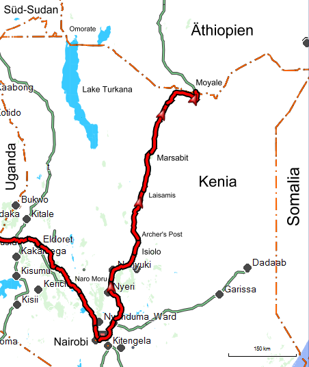 So entschließe ich mich für die stärker frequentierte Route über Moyale. Zweimal war ich hier schon unterwegs, 1993 und 2001. Beide Male musste ich als Anhalter fahren und das Fahrrad verladen, weil wegen regelmäßiger Überfälle Konvoipflicht herrschte. Heute gelten die 500 Kilometer durch den einsamen Norden Kenias als einigermaßen sicher. Nur gelegentlich gebe es noch politisch motivierte Überfälle der Al-Shaabab-Milizen aus Somalia, heißt es. So selten, dass die Konvoipflicht längst aufgehoben wurde.