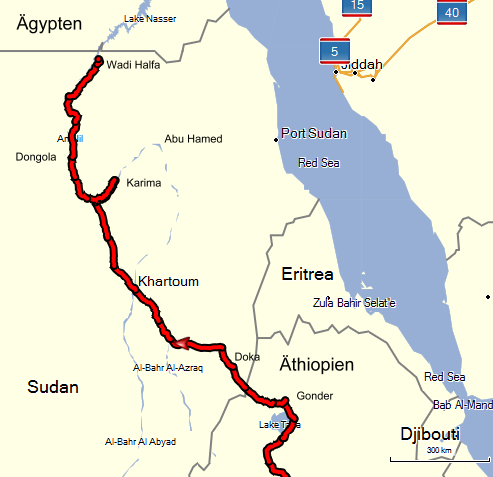 Als ich 1992 in umgekehrter Richtung - von Nord nach Süd - durch den Sudan gefahren bin, war die Hauptroute von der ägyptischen Grenze bis zur Hauptstadt Khartoum noch nicht asphaltiert. Dieser Weg über Dongola war damals eine tiefe Sandpiste, durch die sich allein Lastwagen wühlen konnten. Mir blieb nur die abenteuerliche Route entlang der einsamen Bahngleise durch die Nubische Wüste, 370 Kilometer von Wadi Halfa nach Abu Hamed.