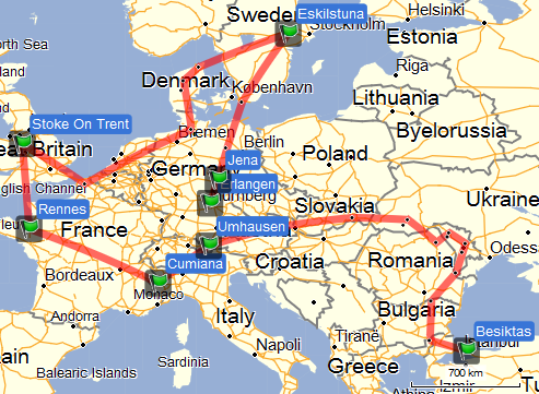 Die Route durch Westeuropa war mit den Erlanger Partnerstädten vorgegeben: Umhausen/Österreich -> Cumiana/Italien -> Rennes/Frankreich -> Stoke-on-Trent/England -> Eskilstuna/Schweden -> Jena -> Erlangen. Der Umweg nach Süddeutschland würde am kürzesten sein, wenn ich ihn zwischen Umhausen und Cumiana einlegen könnte. Das passte allerdings zeitlich nicht mit Regines Geburtstag zusammen. Auch Cumiana-Biberach-Rennes würde noch zu früh sein. Vom Nordwesten Frankreichs nach Biberach und dann nach England zu radeln, wäre vollkommen irre. So beschloss ich also, im Eiltempo bis nach Stoke-on-Trent durchzufahren und von dort Süddeutschland anzupeilen. Auch das freilich ein Umweg von weit über 1000 Kilometern.
