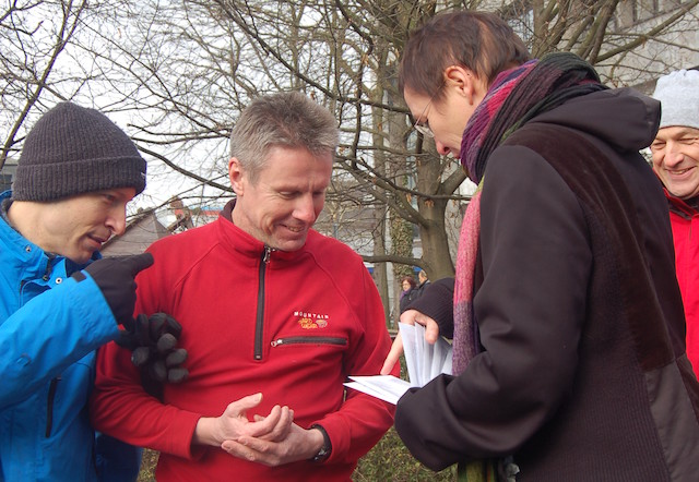 Aufbruch zur Weltumrundung am 28. März 2013 (Gründonnerstag) vor dem Erlanger Rathaus. Bürgermeisterin Dr. Elisabeth Preuß überreicht Peter Smolka die Grußschreiben für alle Erlanger Partnerstädte.