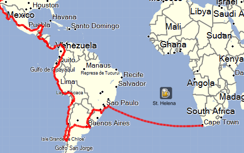 Der Weg der MOL Garland über den Atlantik. An St. Helena fahren wir weit vorbei. Vor 15 Jahren hatte meine Segelbootreise von Kapstadt nach Recife über diese Insel geführt (-> "Jenseits von Afrika" und -> "Die Insel" auf www.lemlem.de).