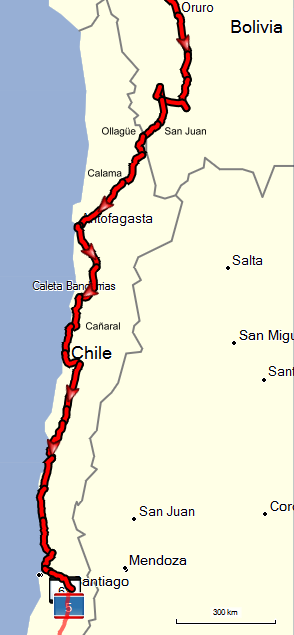 Seit fünf Wochen bin ich nun schon in Chile, diesem langen, schmalen Land. Mehr als 4000 km misst Chile von Norden nach Süden, aber an den meisten Stellen ist das Land nur 100 bis 200 Kilometer breit. Nachdem der Touristenrummel auf dem Salar de Uyuni in Bolivien so unerwartet hoch war, habe ich auf die Lagunenroute südlich des Salars verzichtet und bin auf dem kürzeren Weg über Ollagüe nach Chile eingereist.